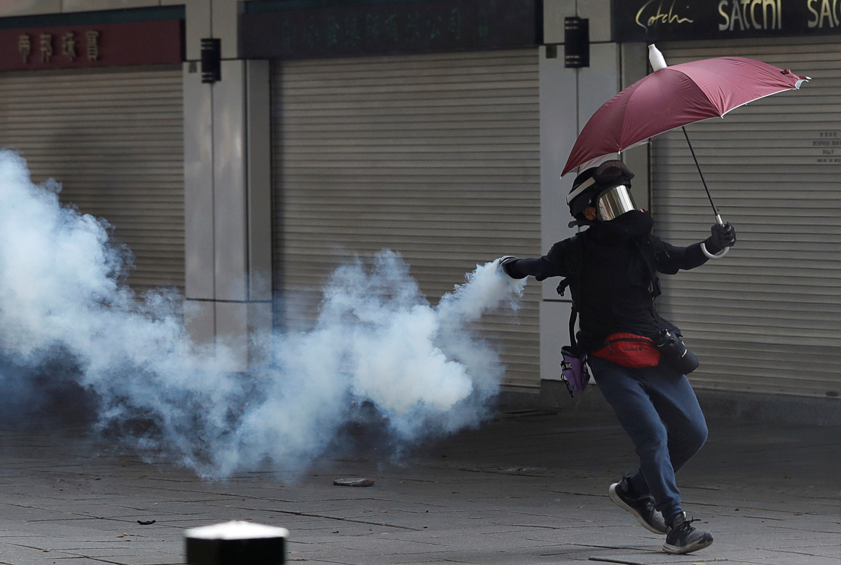 Protesters threw petrol bombs at the Tsim Sha Tsui police station after police inside fired tear gas to disperse demonstrators. One activist urinated onto the police gate.