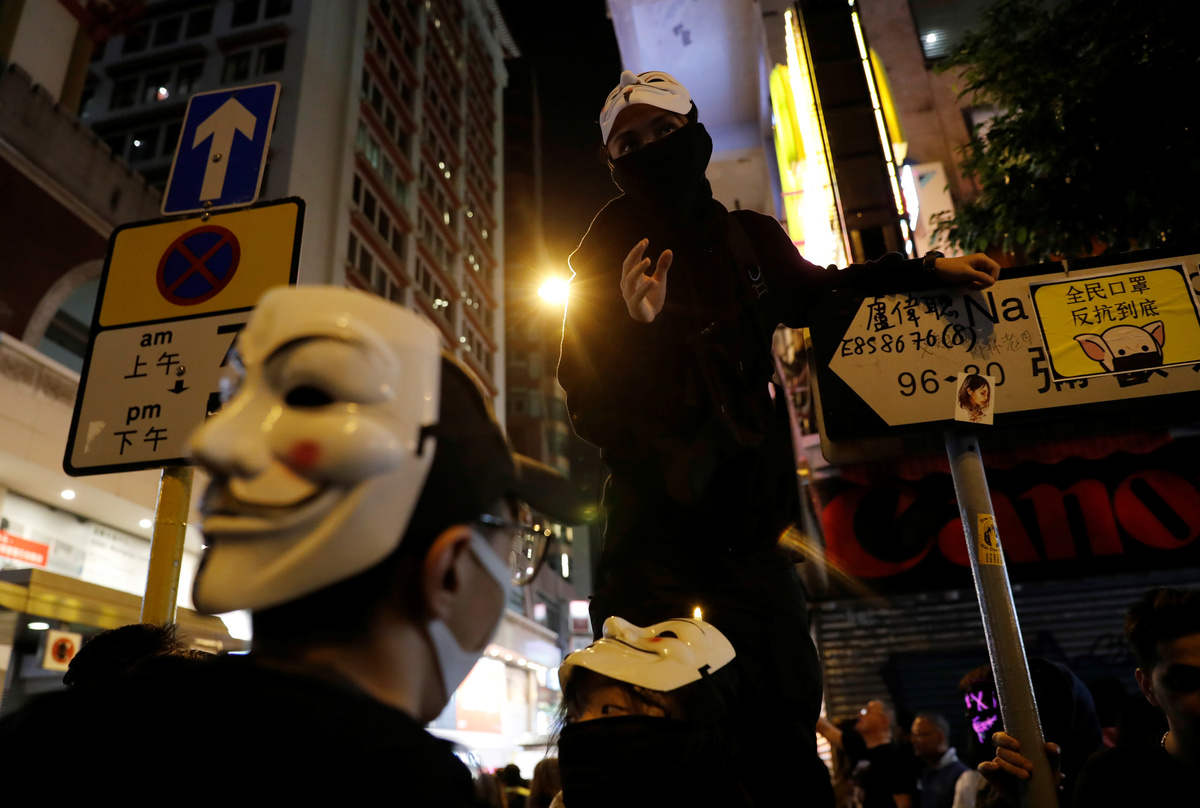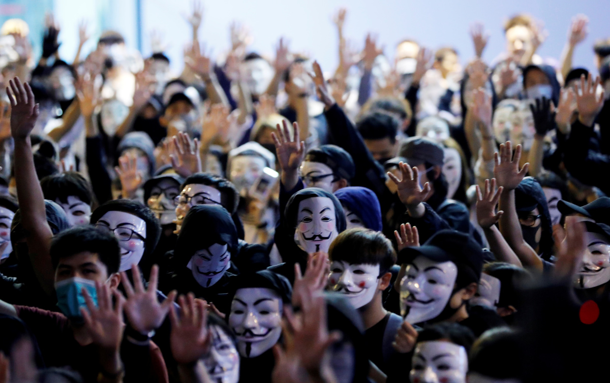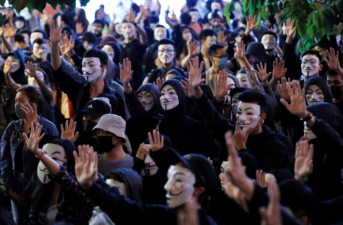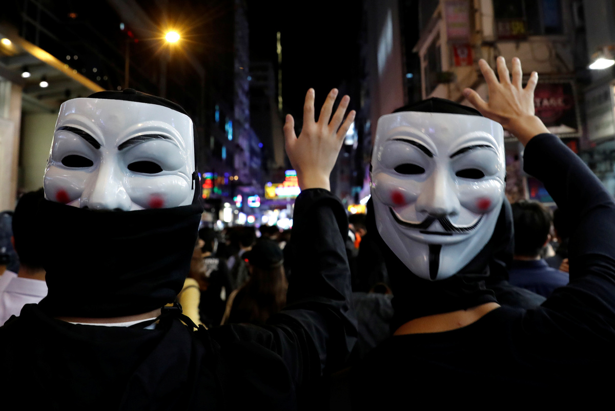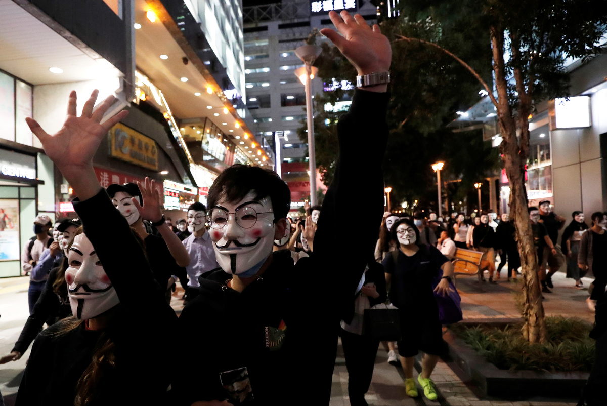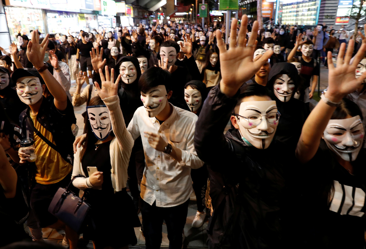 After gatecrashing fancy-dress Halloween festivities on Oct. 31, hundreds of Hong Kong protesters marked Guy Fawkes Day on Tuesday in the Tsim Sha Tsui tourist district of Kowloon by wearing the white, smiling Guy Fawkes masks made popular by anti-establishment hackers, the film "V for Vendetta" and protesters globally.