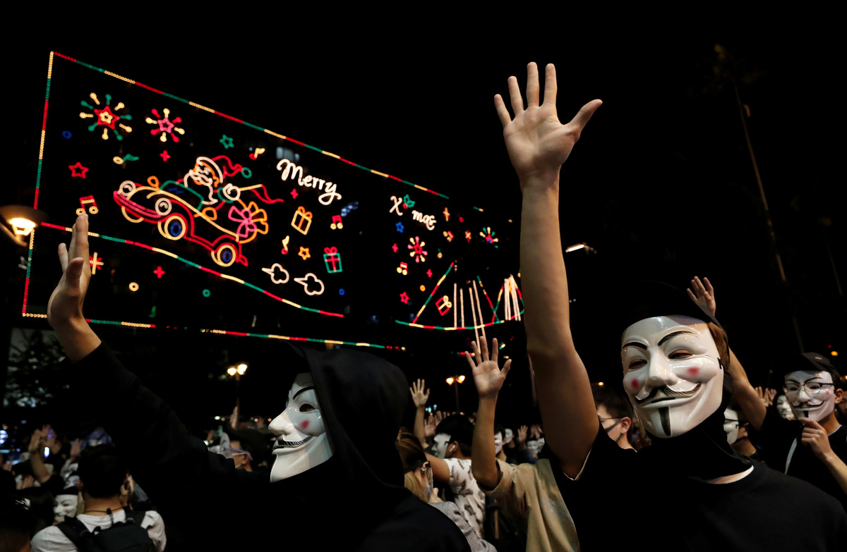 “We are here to tell the government that we are not afraid of them and that they should be afraid of us," masked protester Pete, 27, said in front of the huge, harbourfront neon Christmas decorations.