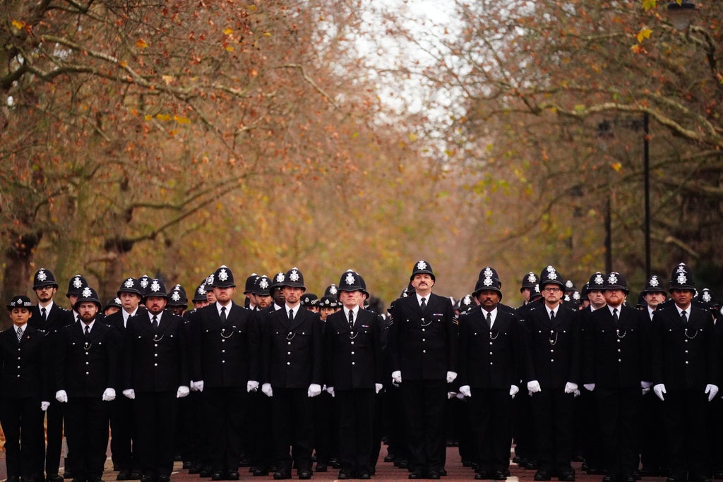 Dame Cressida and Ms Patel exchanged a few words with Ms Bushby at the National Police Memorial near the Mall before joining a procession along Horse Guards Road and Birdcage Walk towards the Royal Military Chapel (the Guard’s Chapel) where the service was held.