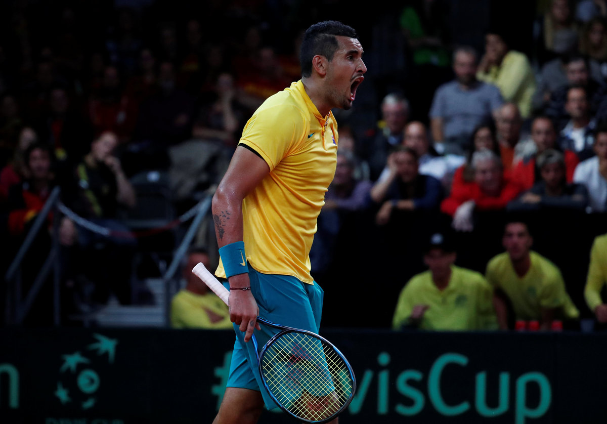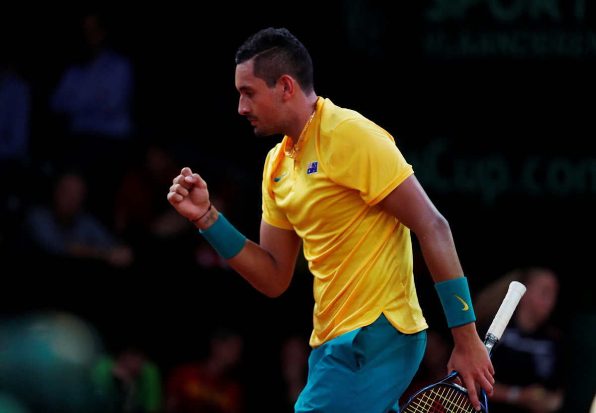 Tennis - Davis Cup - Semi-Finals - Belgium vs Australia - Palais 12, Brussels, Belgium - September 15, 2017 Australia's Nick Kyrgios celebrates during his match against Belgium's Steve Darcis REUTERS/Yves Herman