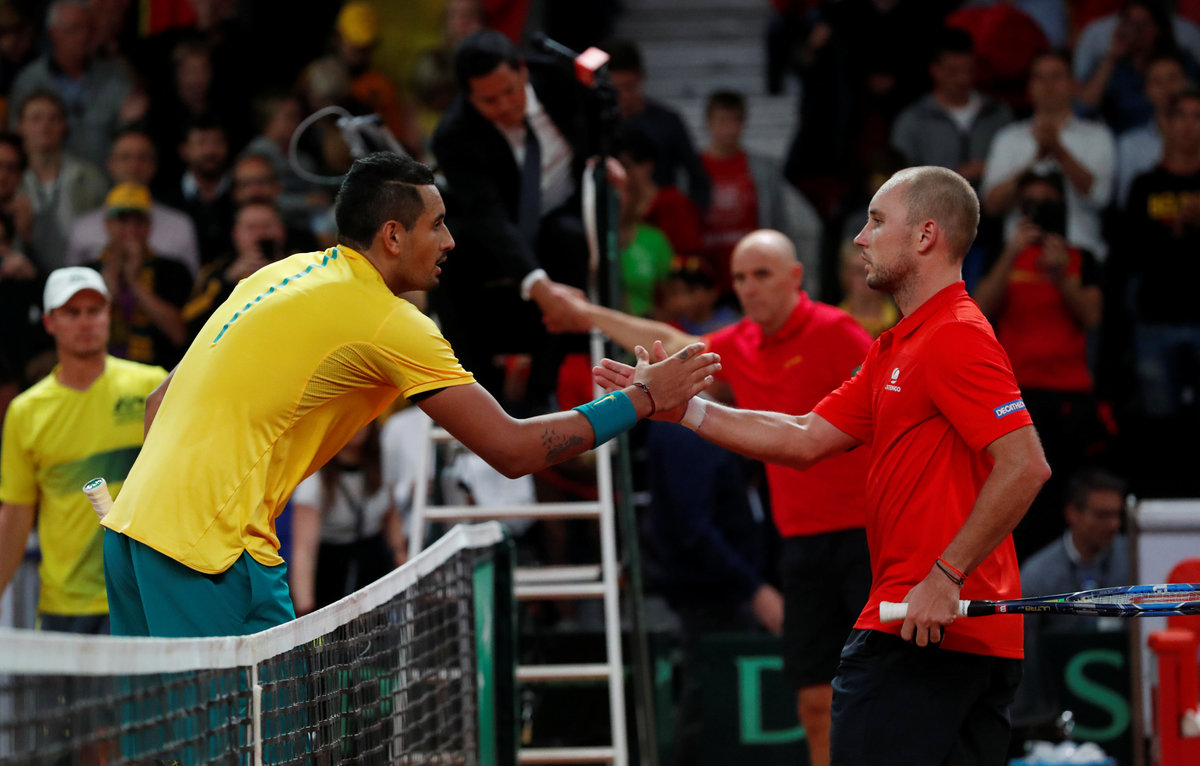 Tennis - Davis Cup - Semi-Finals - Belgium vs Australia - Palais 12, Brussels, Belgium - September 15, 2017 Australia's Nick Kyrgios shakes hands with Belgium's Steve Darcis after winning the match REUTERS/Yves HermanTennis - Davis Cup - Semi-Finals - Belgium vs Australia - Palais 12, Brussels, Belgium - September 15, 2017 Belgium's David Goffin shakes hands with Australia's John Millman after winning the match REUTERS/Yves HermanTennis - Davis Cup - Semi-Finals - Belgium vs Australia - Palais 12, Brussels, Belgium - September 15, 2017 Australia's John Millman during his match against Belgium's David Goffin REUTERS/Yves HermanTennis - Davis Cup - Semi-Finals - Belgium vs Australia - Palais 12, Brussels, Belgium - September 15, 2017 Belgium's David Goffin celebrates during his match against Australia's John Millman REUTERS/Yves HermanTennis - Davis Cup - Semi-Finals - Belgium vs Australia - Palais 12, Brussels, Belgium - September 15, 2017 Australia's John Millman during his match against Belgium's David Goffin REUTERS/Yves Herman