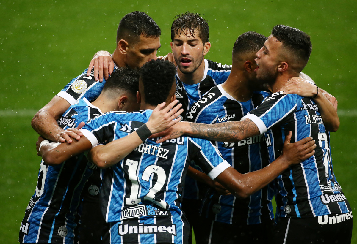 Soccer Football - Brasileiro Championship - Gremio v Internacional - Arena do Gremio, Porto Alegre, Brazil - October 3, 2020 Gremio's Pepe celebrates scoring their first goal with teammates REUTERS/Diego Vara