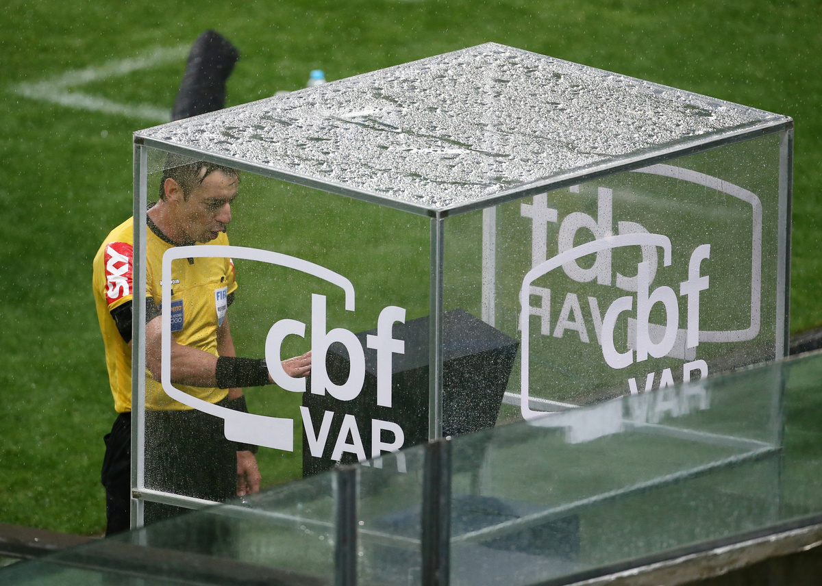 Soccer Football - Brasileiro Championship - Gremio v Internacional - Arena do Gremio, Porto Alegre, Brazil - October 3, 2020 Internacional's Thiago Galhardo celebrates scoring their first goal with teammates as Gremio players look dejected REUTERS/Diego VaraSoccer Football - Brasileiro Championship - Gremio v Internacional - Arena do Gremio, Porto Alegre, Brazil - October 3, 2020 Gremio's Bruno Cortez is shown a yellow card by referee Raphael Claus REUTERS/Diego VaraSoccer Football - Brasileiro Championship - Gremio v Internacional - Arena do Gremio, Porto Alegre, Brazil - October 3, 2020 Referee Raphael Claus refers to VAR during the match REUTERS/Diego Vara