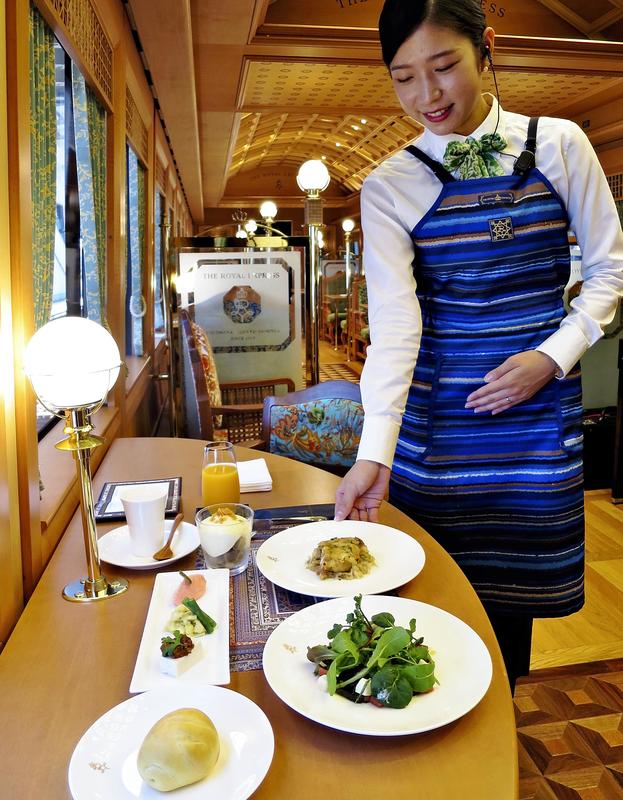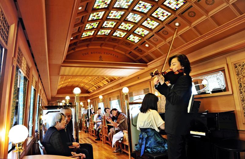The Royal Express offers a tour that includes accommodations at a ryokan inn (from 150,000 yen for one adult) and a one-way ride plan that includes live music and course meals (from 39,000 yen). Hiroyuki Senoo, a public servant from Yokohama who took part in the tour with his wife Chiaki to commemorate their 25 years of marriage, laughed as he said: "I'm satisfied by much more than the price. We've made a good start on our journey towards our 50th wedding anniversary."