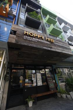 Established by the folks behind the Craftpital bar at W District, Hoppy HRS lies just past the open-air food court between BTS Phra Khanong and Ekamai, on the even side of the road. Inspired from their trip to Chicago and their love for street food in the region (namely hot dogs), owners Sahachol "Micky" Chairat and Phatphitcha "Minnie" Suksangwarn decided to create a bar that could serve as a casual hangout spot where their friends can gather after work and enjoy locally crafted beer and sodas, as well as hot dogs. The small and cosy space gives customers a chance to relax on the couch near the DJ booth and sing their hearts out to 80s-90s alt rock. Anybody up for some karaoke to songs by Oasis?