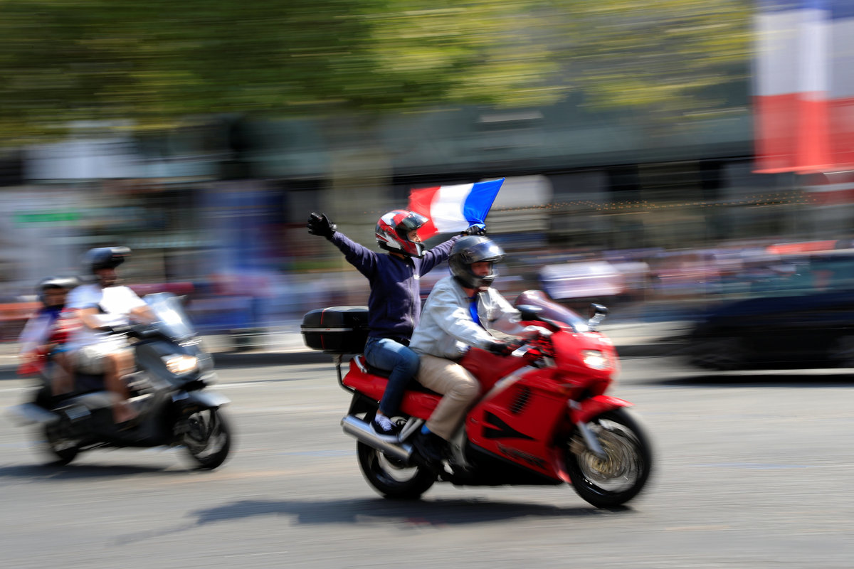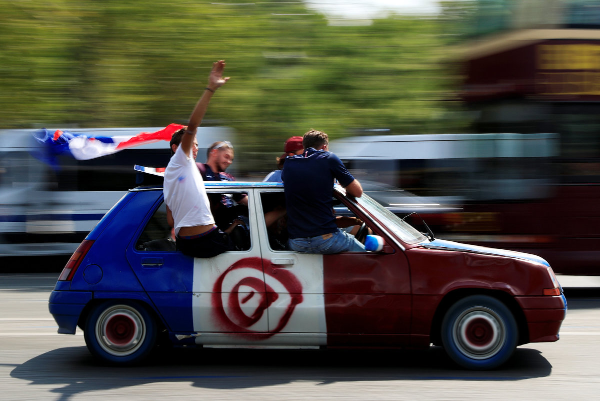 On the Champs Elysees, horns were blaring, tricolor flags waving and a group of fans jumped up and down on a red, white and blue car, blaring pro-France songs from a speaker.