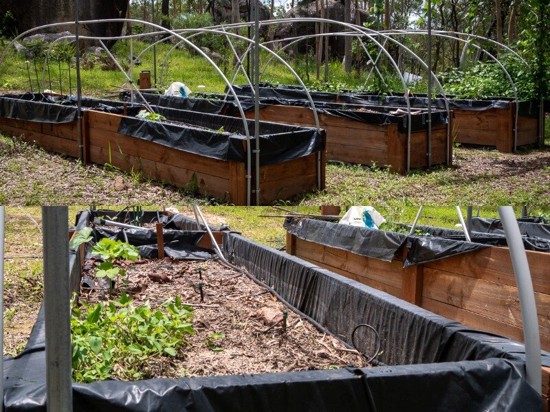There are irrigated experimental plots of native fruits, vegetables and herbs growing in greenhouses, and garden beds interspersed with caravans.