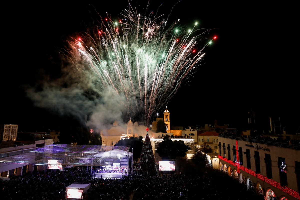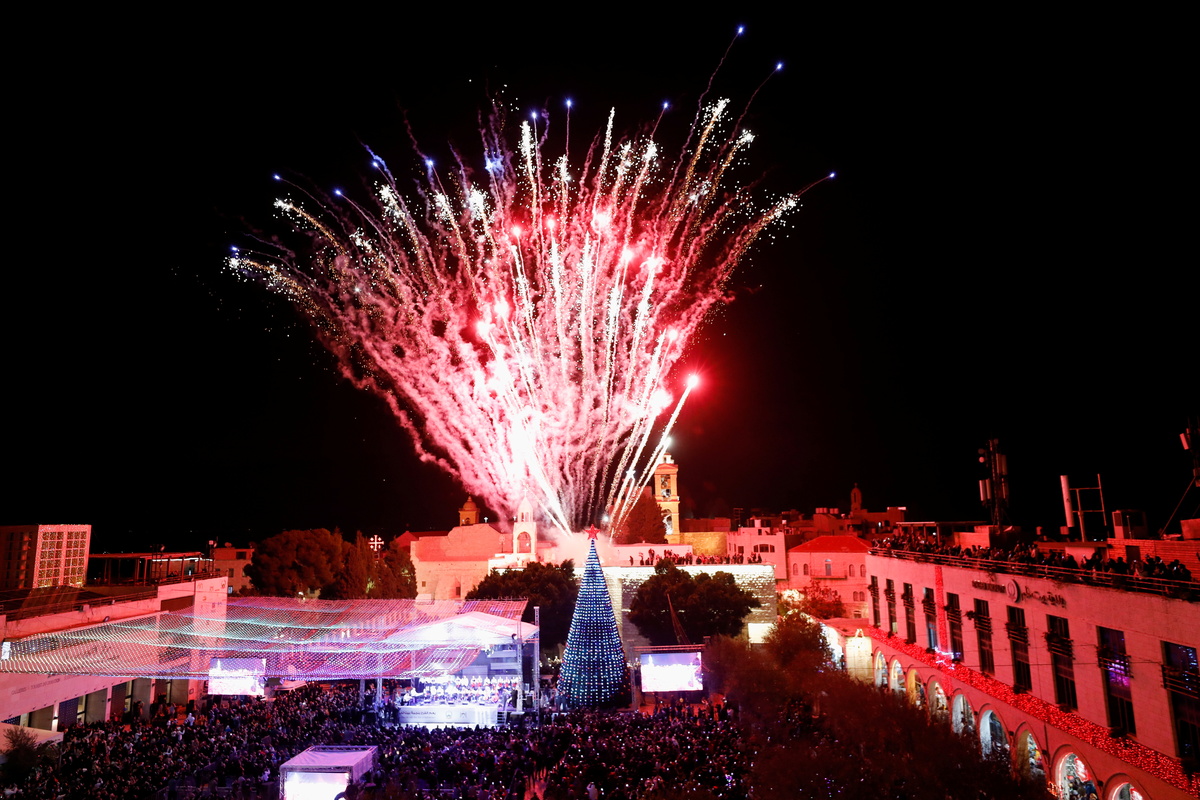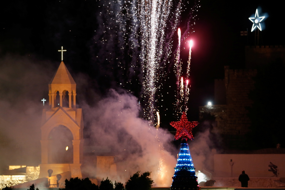 Residents lit up a giant Christmas tree outside Bethlehem's Church of the Nativity on Saturday, hoping that a new coronavirus variant doesn't ruin another holiday season in the traditional birthplace of Jesus.