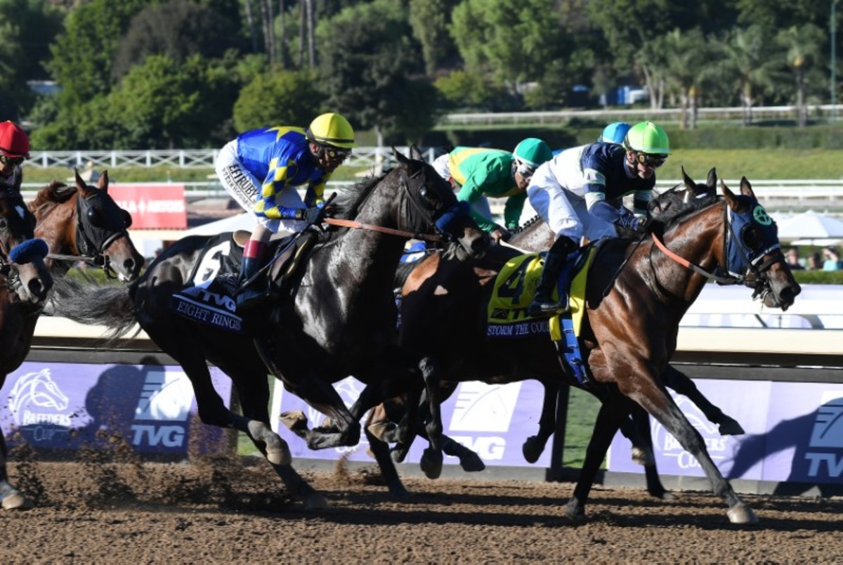 Nov 1, 2019; San Anita, CA, USA; Flavien Prat aboard Storm the Court (4) and John Velazquez aboard Eight Rings (6) and Juan Hernandez aboard Anneau d'Or (7) race during the TVG Juvenile race in the 36th Breeders Cup world championships at Santa Anita Park. Mandatory Credit: Kelvin Kuo-USA TODAY SportsNov 1, 2019; San Anita, CA, USA; Flavien Prat aboard Storm the Court (4) and John Velazquez aboard Eight Rings (6) race during the TVG Juvenile race in the 36th Breeders Cup world championships at Santa Anita Park. Mandatory Credit: Richard Mackson-USA TODAY Sports