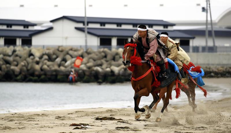 About 10 horses with riders in traditional samurai garb race along a beach in Soma, Fukushima Prefecture, on Saturday, during festivities celebrating the reconstruction of buildings at a local shrine.