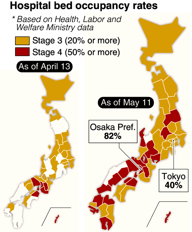The hospital bed occupancy rate, which indicates the percentage of hospital beds secured by prefectures that are used by inpatients, is one of the six criteria set by the government to analyze the infection situation in the nation. The ministry releases updated data once a week.