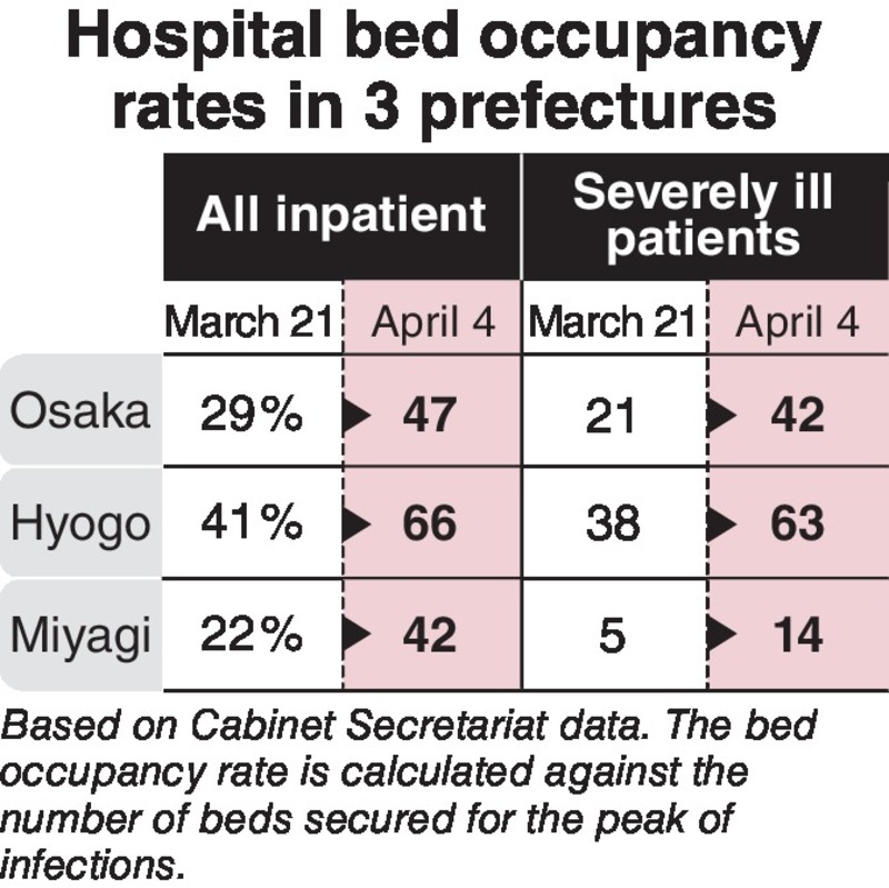 The situation of hospital bed occupancy rates is most serious in Hyogo Prefecture. The occupancy rate of hospital beds secured for COVID-19 patients had increased to 66% as of Sunday, up from 41% two weeks earlier on March 21, according to the Cabinet Secretariat. An occupancy rate exceeding 50% falls within Stage 4, the most serious stage.
