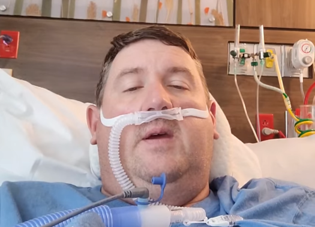 Travis Campbell, of Bristol, was first hospitalised last month and has been documenting his treatment, hooked up to oxygen and machines and often struggling to breathe. He said he regrets not getting the vaccine for his wife, children or himself.