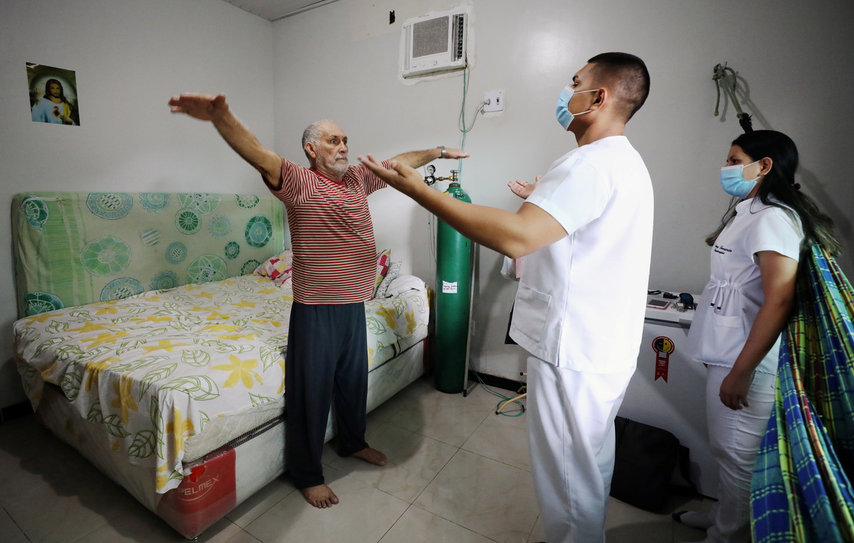 Two therapists check his pulse and oxygen saturation, massage his back and help him do daily exercises. The treatment has put him out of danger and reduced his dependence on the oxygen tank.