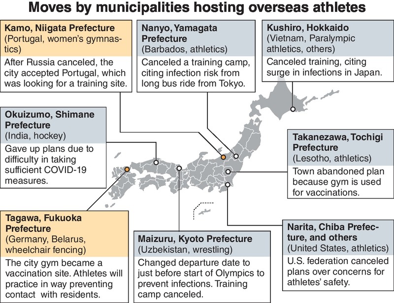 Municipalities that had enthusiastically signed on to host Olympic and Paralympic athletes from overseas are now wringing their hands, wondering how they will manage amid a pandemic still going strong with less than 50 days to go until the opening of the Tokyo Olympics.