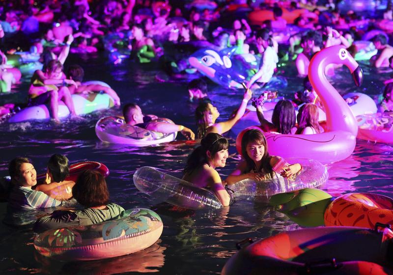With even nighttime not providing relief from the relentless heat wave sweeping the nation, many find comfort in the swimming pool at Lagunasia theme park in Gamagori, Aichi Prefecture, which is open in the evening everyday in August (on weekends and holidays from Sept. 1 to 22). Big-beat music and blue, orange and green lights liven up the mood as visitors take selfies while cooling off.