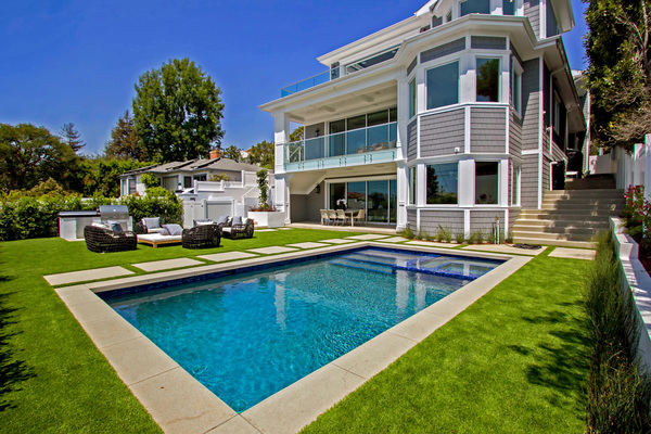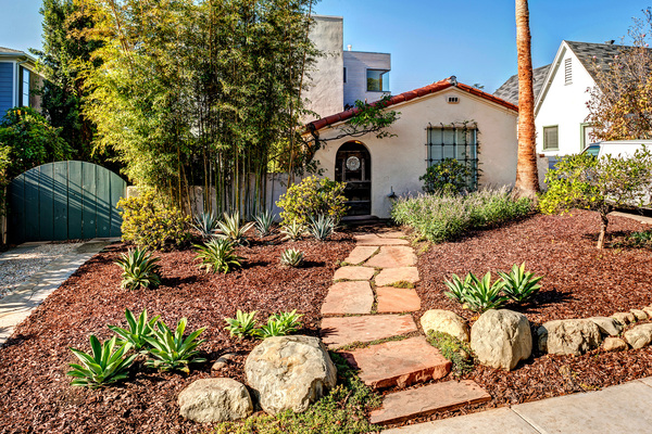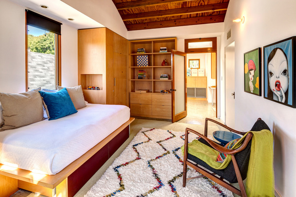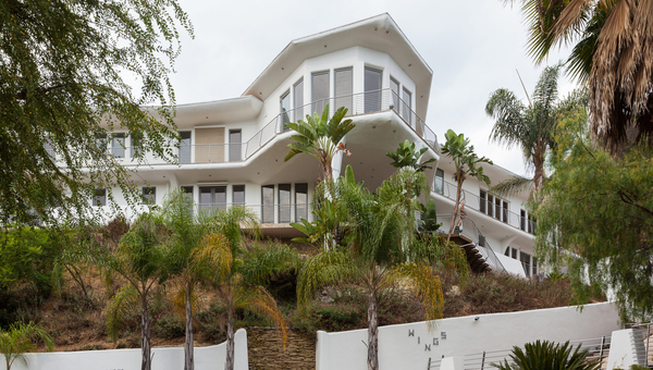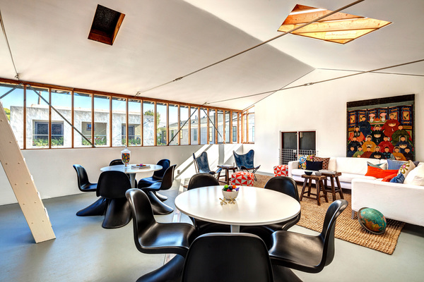 A two-story studio designed by architectural firm Koning Eizenberg and a third structure currently used as a gym also reside on grounds filled with drought-tolerant plantings and palms.