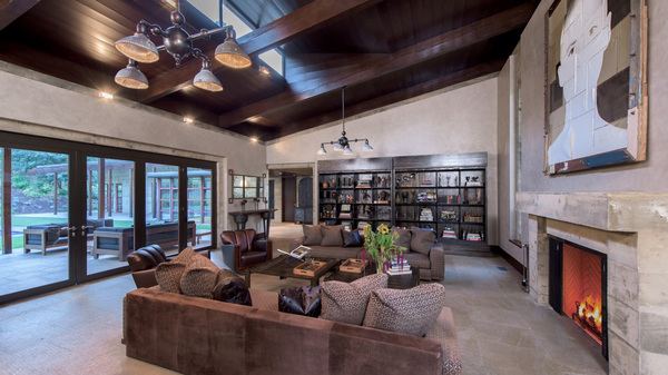 Inside, poured-concrete walls, steel-framed windows and vaulted ceilings give an atrium feel to the 5,500 square feet of living space, which includes a great room with a fireplace, an open-plan kitchen and a media room. The master suite has a separate office/den and a metallic soaking tub.