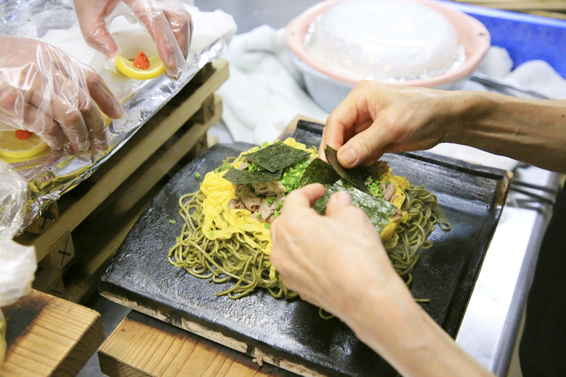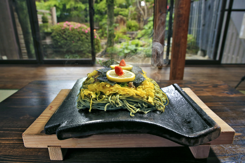 The dish, called kawara-soba, was devised in 1962 by Ganso Kawara-soba Takase, a restaurant in the Kawatana hot spring resort in a mountainous area of Shimonoseki, Yamaguchi Prefecture. This specialty is currently available for 1,188 yen.