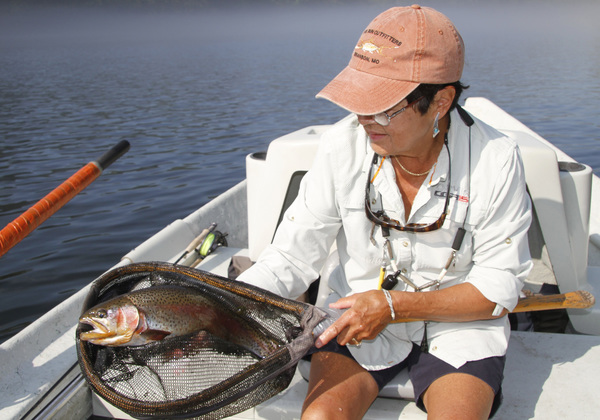 Ten minutes after her first cast, Parker caught the first trout of the day on her fly rod. Not much later the second fish, a 19-inch rainbow that was softball fat from back to belly, took nearly five minutes from hook set to net. For most of the morning, the fishing stayed as hot as the weather.