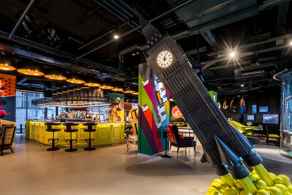 The industrial look – silver venting crossing the ceiling, bare walls given just a lick of paint – is softened by a riot of quirk and colour, something of an nhow signature. It’s pure fantasy decor across the ground: a scaled-down Elizabeth Tower (home to Big Ben) sits at an angle and appears to be blasting off, denim jackets covered in textile offcuts are used as lightshades, long tables are patterned with off-colour Union flags and pillars are adorned with images of multi-coloured toast above greyscale toasters. Even the most ardent minimalist guests will agree that the jumble works.