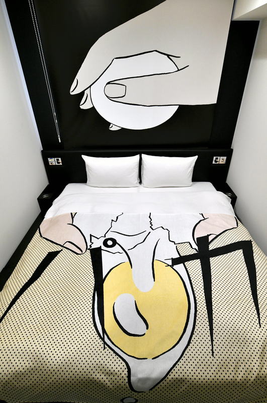 These include a bedcover with an illustration of an egg being cracked for frying with the sound effect "paka" written in Japanese, and carpeting in the corridors with katakana characters reading "teku teku," onomatopoeia that expresses the sound of footsteps.