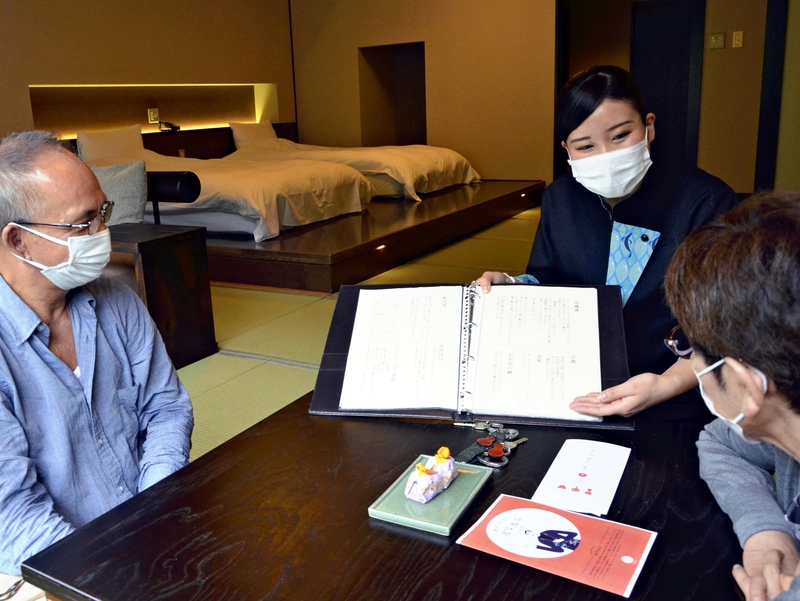 When customers arrive at Hoshino Resorts KAI Kawaji, in the Kawaji Onsen hot spring area in Nikko, Tochigi Prefecture, they are asked to have their body temperature checked and disinfect their hands. Then they are directly shown to their rooms. This check-in procedure is applied to every guest.