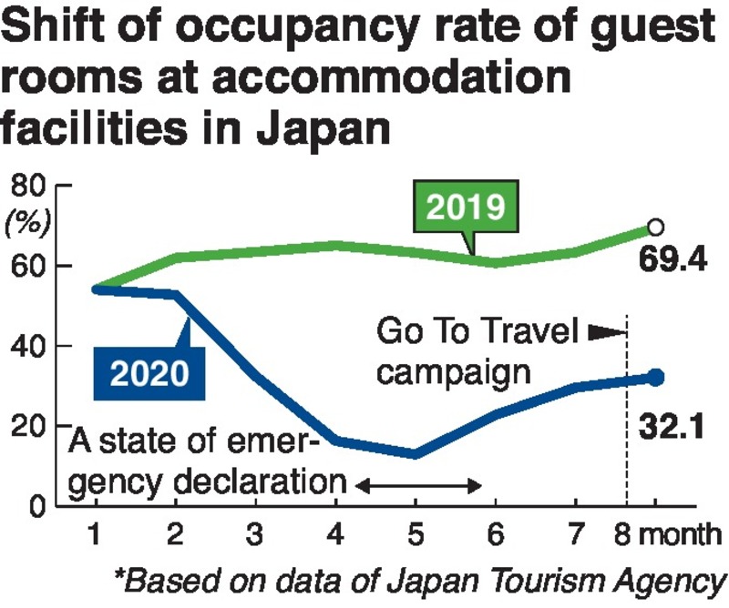 After that, partly due to the effects of the Go To Travel campaign, the total number of overnight customers has gradually increased, but the figure as of August did not reach to even half of the year-earlier level.