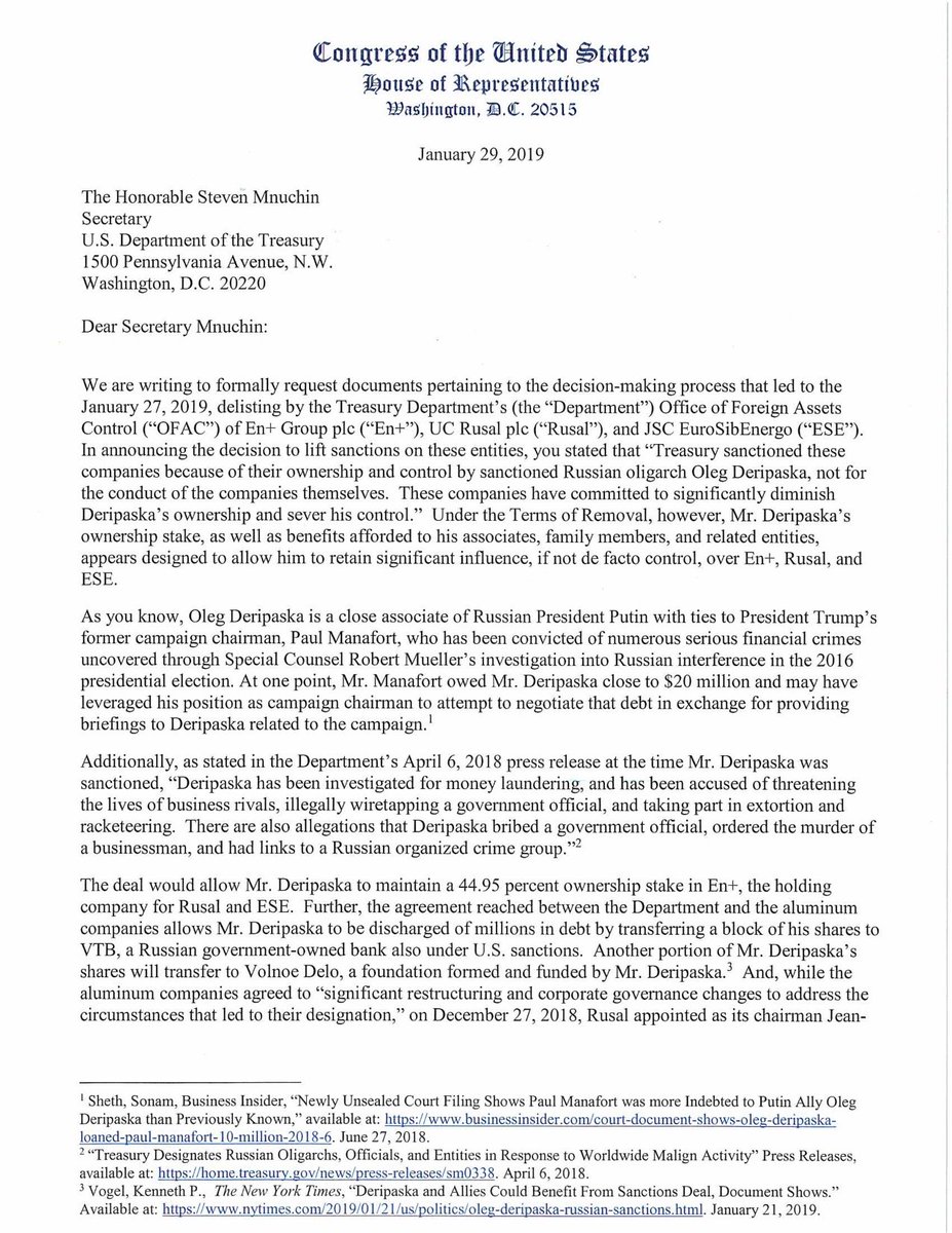 The backdrop: Treasury lifted sanctions Sunday on three companies linked to Deripaska, who once employed former Trump campaign chairman Paul Manafort and is under scrutiny for his possible involvement in Russian interference in the 2016 election. When Treasury Secretary Steve Mnuchin briefed lawmakers on the decision to lift sanctions, House Speaker Nancy Pelosi called it "one of the worst classified briefings" she'd ever received.