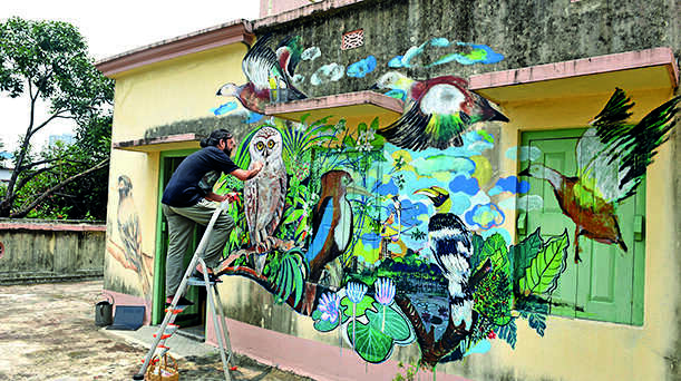 Nilanjan Chowdhury, a visual artist who works in Delhi but staying in his sister’s house in Bhowanipore since last year’s lockdown, has been bringing the faded walls to life with gorgeous paintings of birds, all of which he either spotted on the adjoining jamun tree or at Rabindra Sarobar.