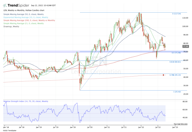On the upside, bulls really need to see Lennar stock get above and stay above the $80 to $82 area. If it can do that, it puts the shares over the 10-week and 21-week moving averages and opens the door to the $89 area and the 50-week moving average.