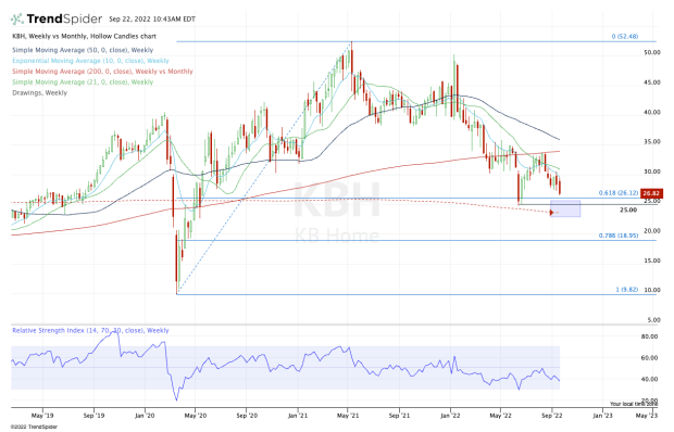 On the upside, I see $30 to $32 as resistance, provided KB Home stock can get above its 10-week and 21-week moving averages.