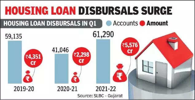 AHMEDABAD: Backed by buoyant demand for affordable as well as luxury homes, the disbursals for housing finance loans are showing a steep surge. According to the latest report by State Level Bankers’ Committee (SLBC), housing finance disbursals stood at Rs 5,576 crore in the first quarter of 2021-22, up 142% against Rs 2,298 crore in the corresponding quarter of 2020-21, albeit on a low-base effect due to the lockdown imposed in most part of the first quarter last year.