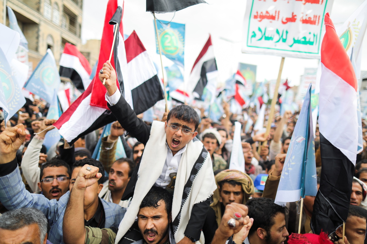 A vast crowd of supporters thronged Sanaa's central public squares waving the red, white and black national colours, and chanting slogans against Saudi Arabia, Israel and the United States. Some carried signs that read "Death to America".