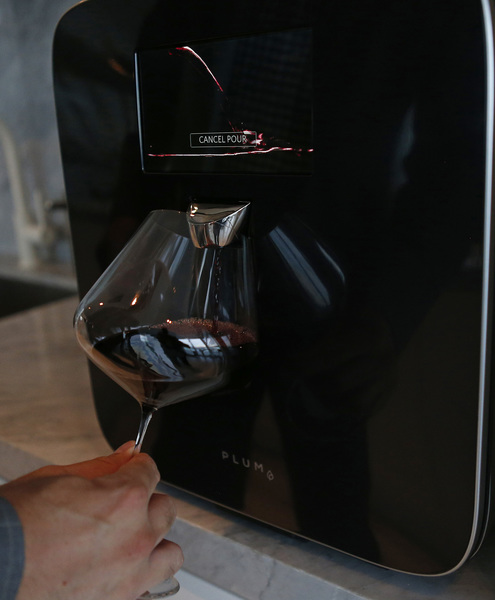 The moment you pull a cork out of a bottle, the oxidation process starts, so in Plum's appliance, a motorized needle instead pierces the cork, pressurizes the bottle and sucks the wine out without introducing oxidation, Koretz said. "So what we have done is built something where you can drop in two bottles of wine, put it on tap and it is perfect."