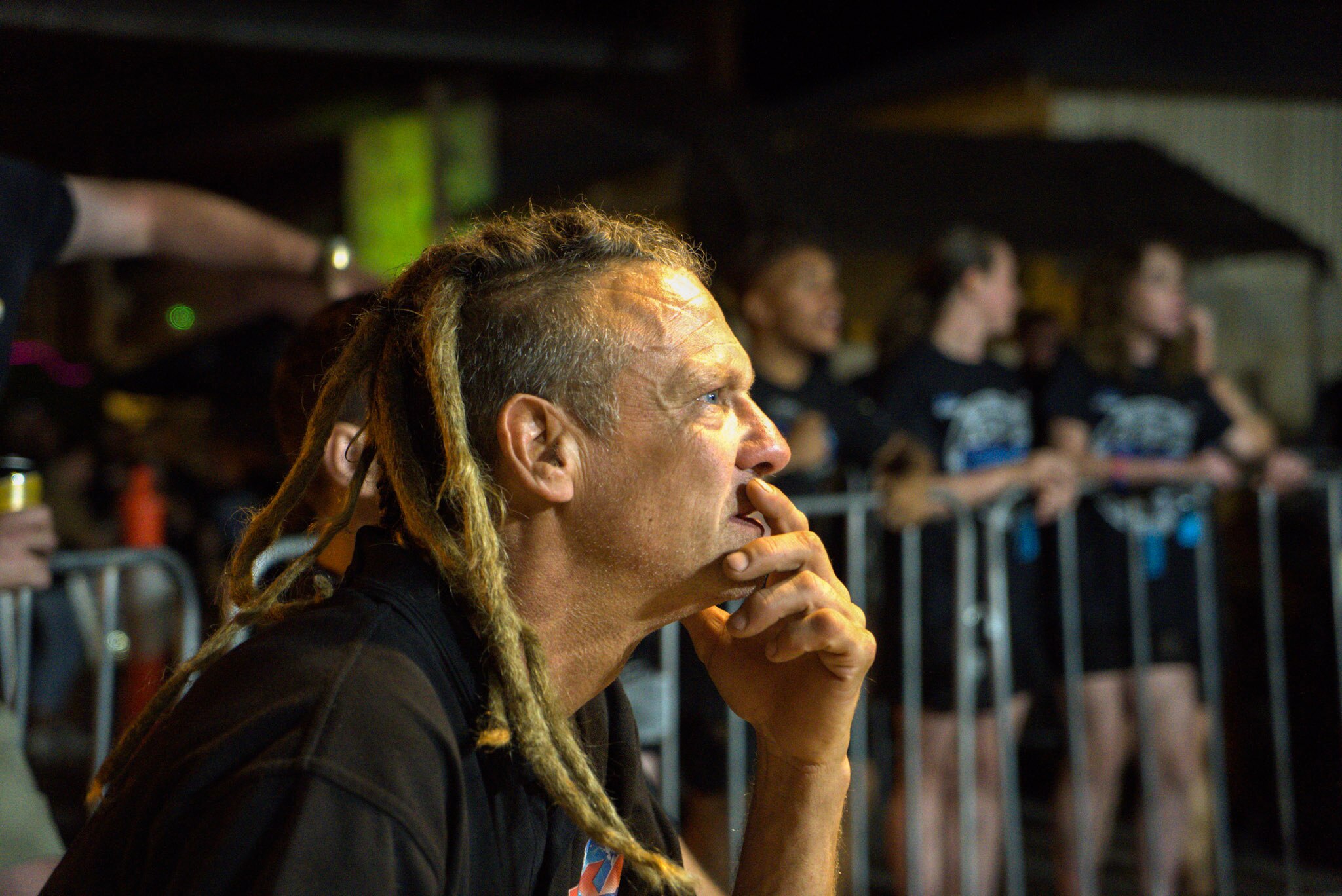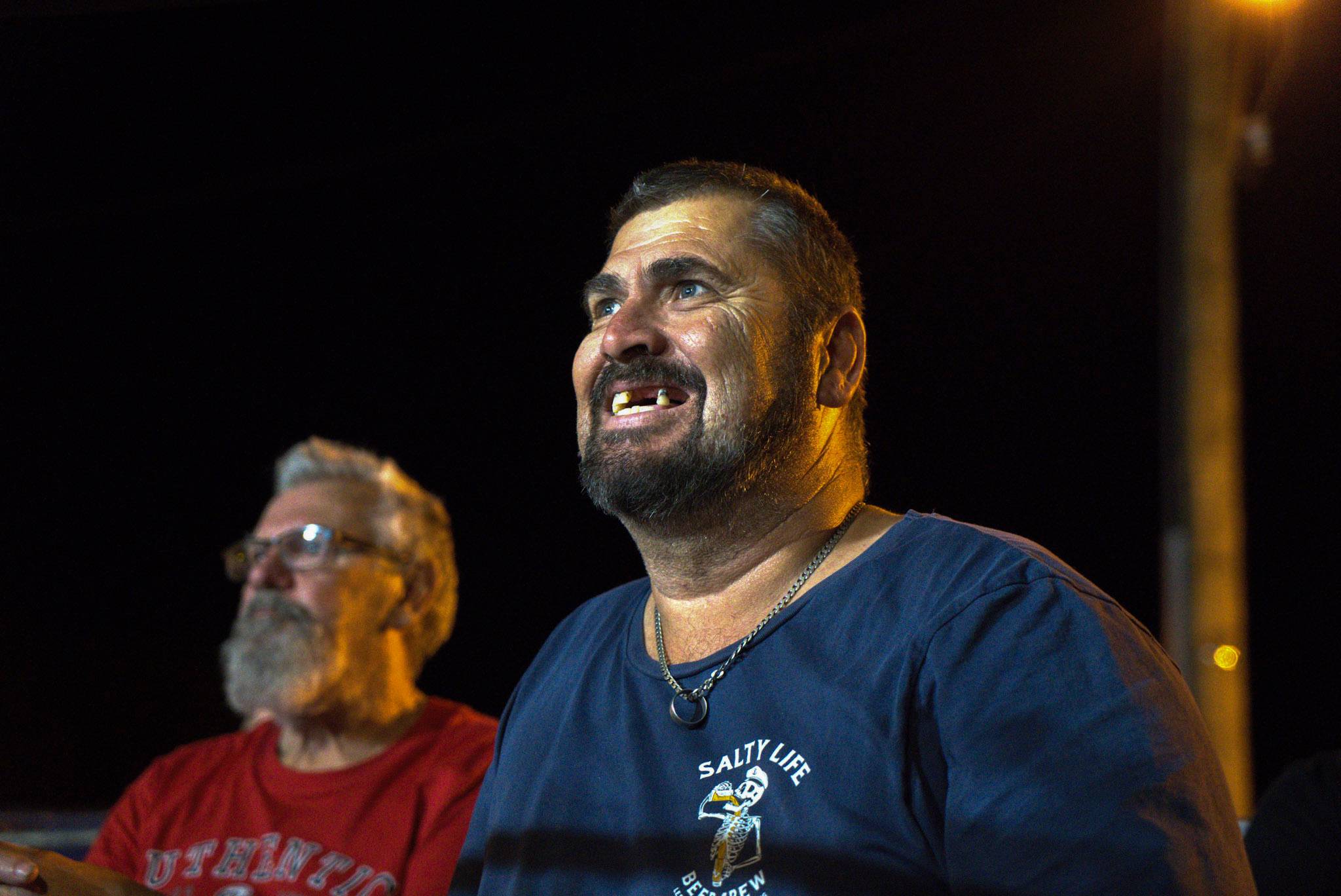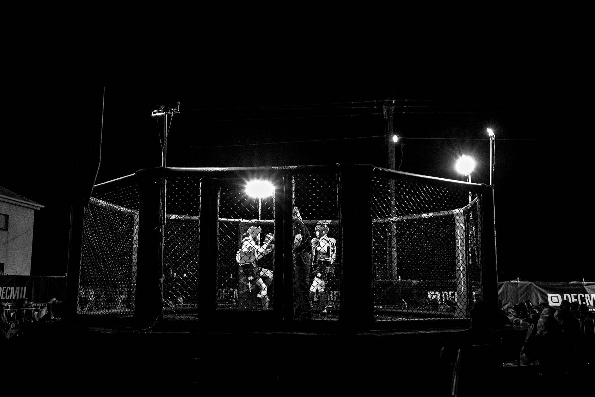 The air is still and thick, black shades enclose an arena in the car park of a local pub.