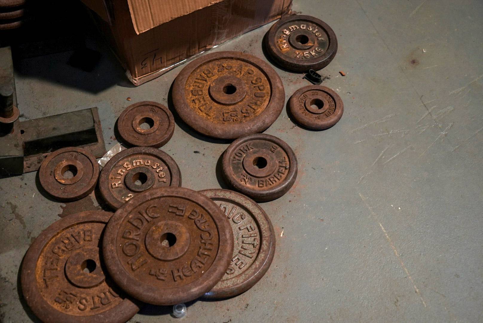 Oxidised weights cluster in circles like burnt pancakes, while boxing gloves lie scattered on the dusty floor.
