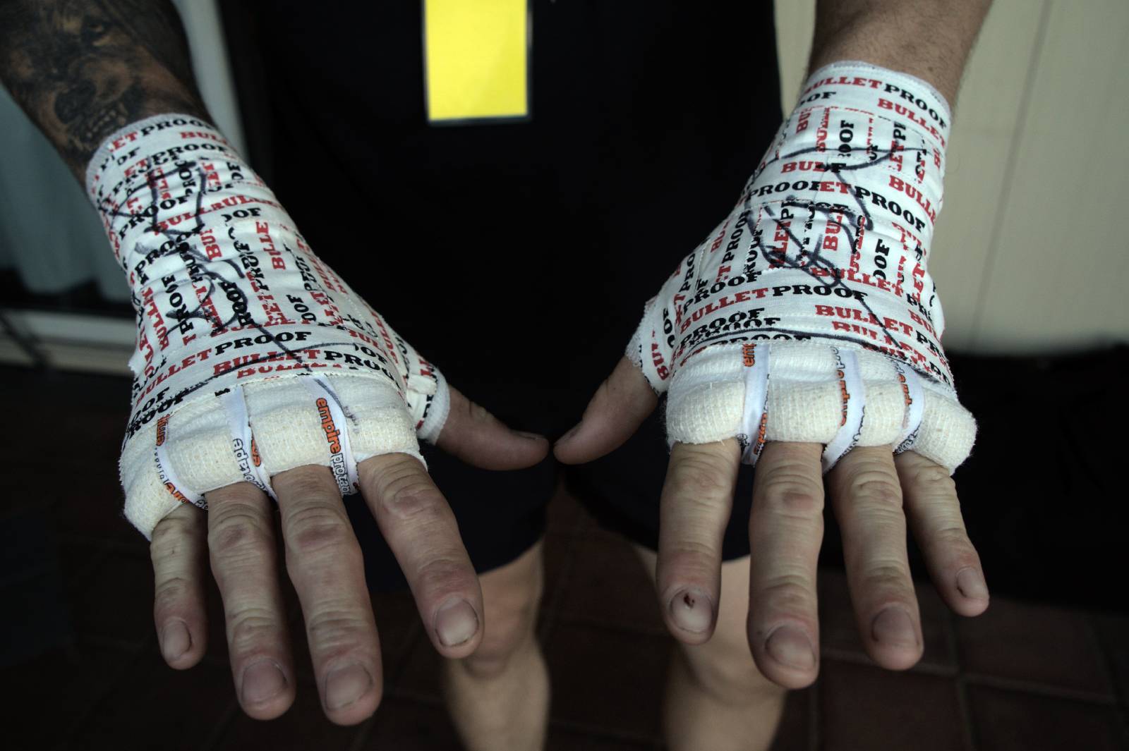 Sitting in one of the pub's basic motel rooms, Fi and Guy wrap the hands of those they've trained.