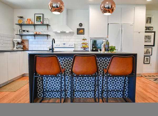 For the kitchen's black-and-white color scheme, Lyndsie chose durable Dekton on the island and countertops and white appliances, to better blend with the cabinets and oversized subway-tile backsplash. When you walk in the front entry, your eye is drawn to the star-patterned tile on the island front, rather than a huge stainless-steel refrigerator, she noted.