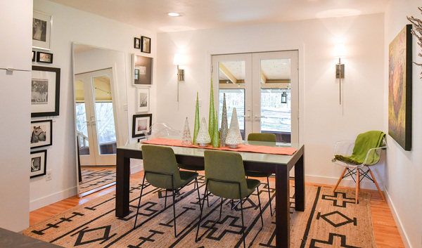 In the adjacent dining room, Lyndsie removed the dark laminate wood-look paneling, and covered the walls with a fresh coat of white paint, accented with a large mirror leaning against a wall. "Light from the new French doors bounces off the mirror and makes the space feel larger," she said.