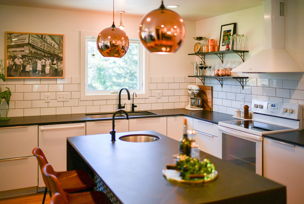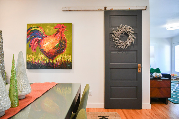 For eye-catching interest, Lyndsie juxtaposed "rural rustic" reclaimed barnwood and bold rooster artwork with sleek modern elements, such as Tom Dixon-style copper-shade pendant lights.