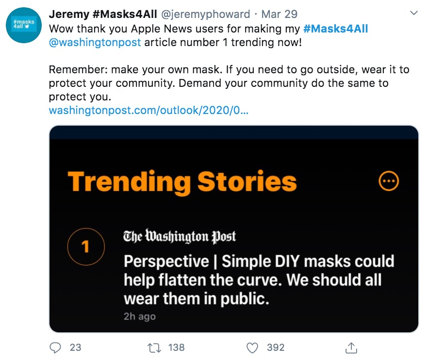 Perla's instinct was right: The graphic reached people with the resources to make it take off. It specifically reached Jeremy Howard, an Australian data scientist with 98,000 Twitter followers. He's the co-founder of a pro-mask movement known by the hashtag #Masks4all. (Inverse repeatedly requested comment from Howard for this story but couldn't reach him.)