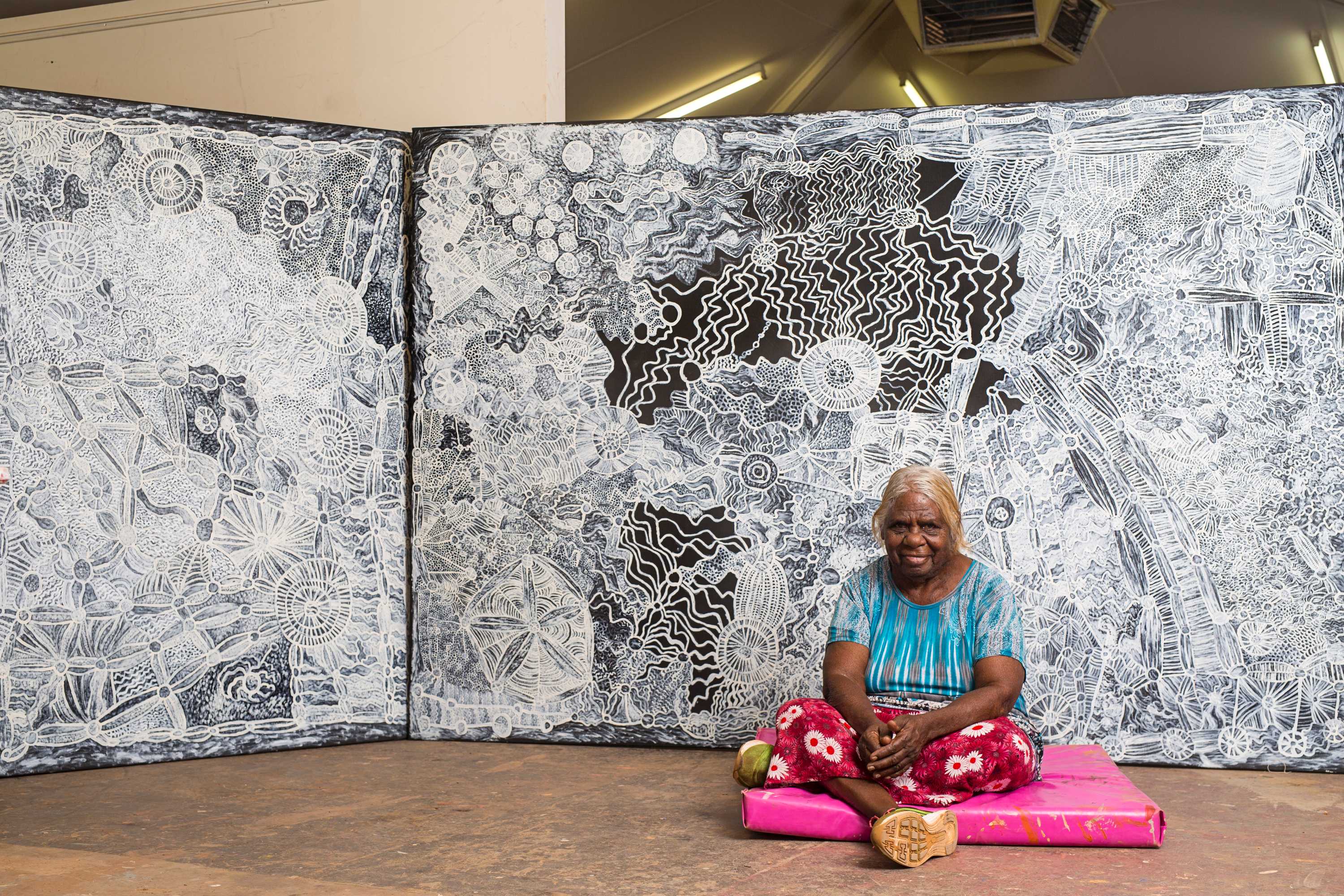 "That motion of moving across the work has actually got the power to heal, because, of course as a ngangkari, she has mara ala, she has open hands, her hands are taking that power from her body. And that power is being placed along that canvas."