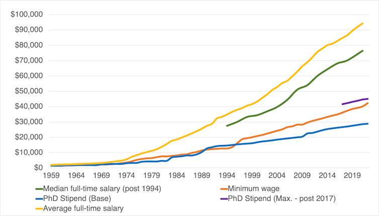 In weekly terms an income of $554.88 puts PhD candidates well below the poverty line of $608.96 for a single person if they have to pay for housing. Further, it’s close to an all-time low of 30% as a proportion of average full-time earnings.