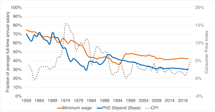 Alternately, we can plot the PhD base rate and minimum wage as proportions of the average full-time income. Also shown is the consumer price index (CPI) as a standard measure of inflation, to give us some context – especially at this time of soaring living costs.