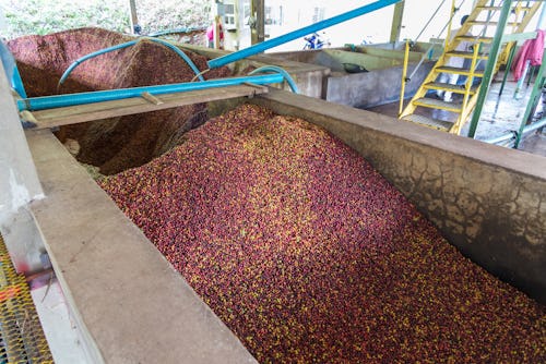 Coffee beans don't come out of the ground as a dark, roasted bean that's waiting to be ground up and brewed. They're planted and, in 3-4 years, are cultivated into trees that produce cherry-like fruits. Within the fruits are the seeds we use for coffee. Harvesters pick the cherries when they're ripe, remove the pulp, and dry the beans. After they're dried, the beans go through a processing station to remove any husks or clinging plant skin. Then, they're sorted by size and weight before getting exported as 'green coffee' — AKA unroasted coffee beans.