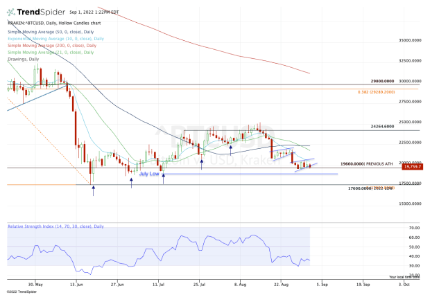 It will also put it below the August low, technically triggering a monthly-down rotation. Buyers have shown up around $19,000 this summer, but if we get a real flush to the downside, don’t be surprised if bitcoin revisits the low near $17,600. Below that and new lows are on tap.