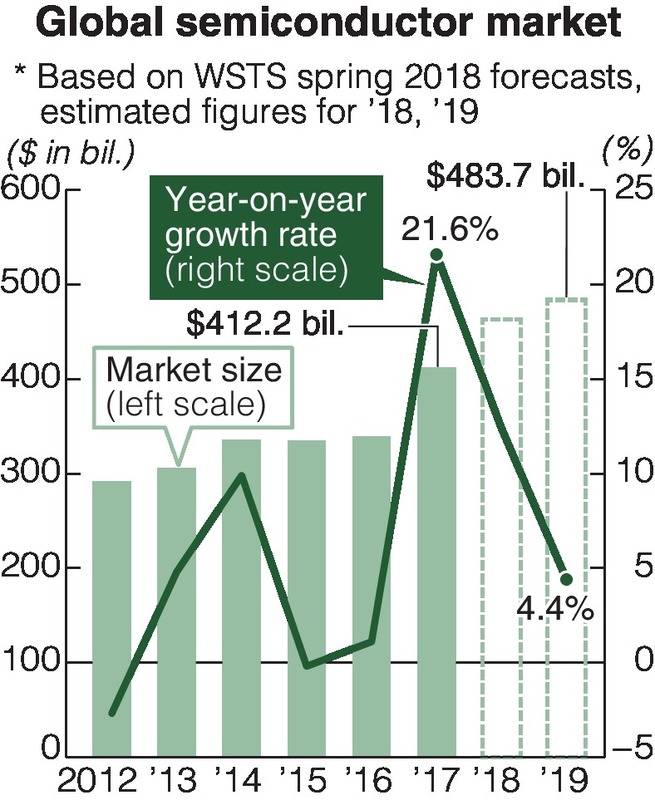 [According to World Semiconductor Trade Statistics, the 2017 global market expanded 21.6 percent from the previous year to reach 412.2 billion dollars (about 46 trillion yen). The market is forecast to grow 12.4 percent in 2018.]