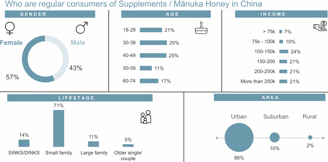 The duel motivators of being trendy and ethical are even more prevalent when it comes to the mānuka honey and supplements market, the NZTE research shows. In that category, 31 percent of shoppers are swayed by “on trend” products when it comes to their spending decisions, and ethical products attract 21 percent.